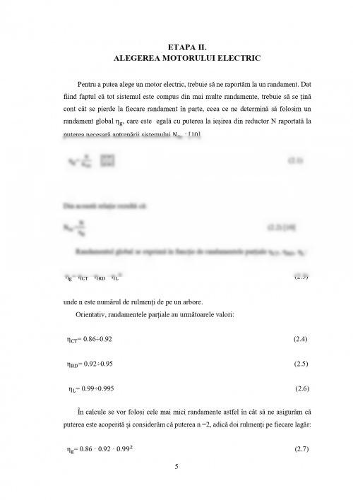 Pentru a putea alege un motor electric, trebuie să ne raportăm la un randament. Dat fiind faptul că tot sistemul este compus din mai multe randamente, trebuie să se țină cont cât se pierde la fiecare randament în parte, ceea ce ne determină să folosim un randament global η_g, care este egală cu puterea la ieșirea din reductor N raportată la puterea necesară antrenării sistemului N_0c : [10]