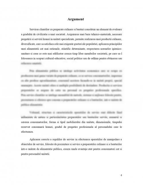 Servirea clientilor cu preparate culinare si bauturi constituie un element de evaloare a gradului de civilizatie a unei societati. Asigurarea unei baze tehnico-materiale, necesare pregatirii si servirii hranei in unitati specializate, permite realizarea unei productii culinare, diversificate, care sa satisfaca cele mai exigente gusturi ale populatiei, aplicarea principiilor unei alimentatii cat mai rationale, stiintific determinate, respectarea normelor igienico-sanitare si ceea ce este mai edificator creaza timp liber membrilor societatii, pe care sa-l foloseasca in scopuri cultural-educative, social politice sau de odihna pentru obtinerea sau refacerea sanatatii.