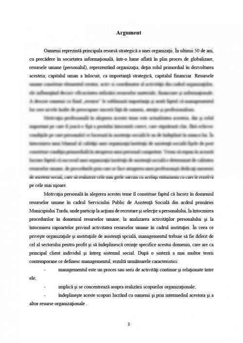 Motivaţia personală în alegerea acestei teme îl constituie faptul că lucrez în domeniul resurselor umane în cadrul Serviciului Public de Asistenţă Socială din acdrul primăriei Municipiului Turda, unde particip la acţiuni de recrutare şi selecţie a personalului, la întocmirea procedurilor în domeniul resurselor umane, la analizarea activităţilor personalului şi la întocmirea rapoartelor privind activitatea resurselor umane în cadrul instituţiei. În ceea ce priveşte organizaţiile şi instituţiile de asistenţă spcială, managementul trebuie să fie diferit de cel al sectorului pentru profit şi să îndeplinescă cerinţe specifice acestui domeniu, care are ca principal client individul şi întreg sistemul social.